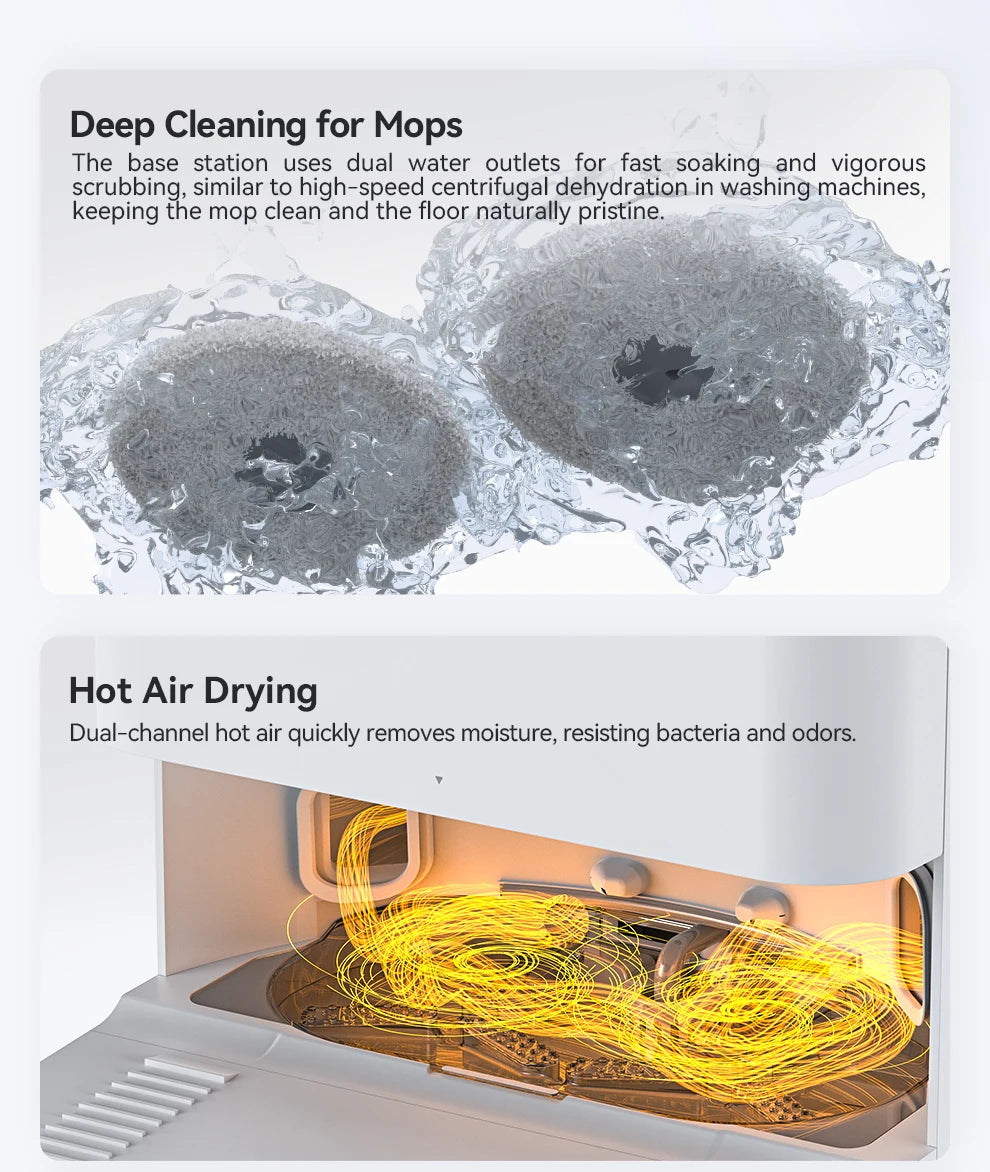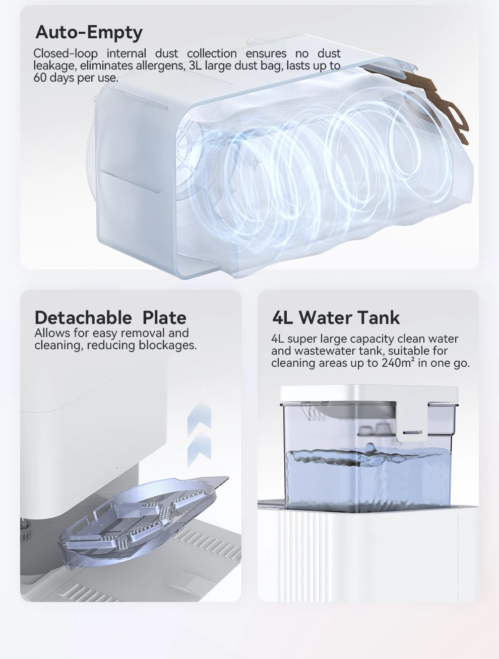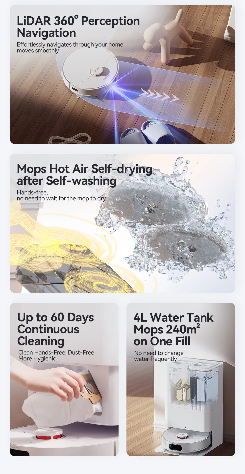 - Alles-in-één schoonmaaksysteem: stofzuigen, dweilen, drogen en automatisch legen voor totale handsfree reiniging.